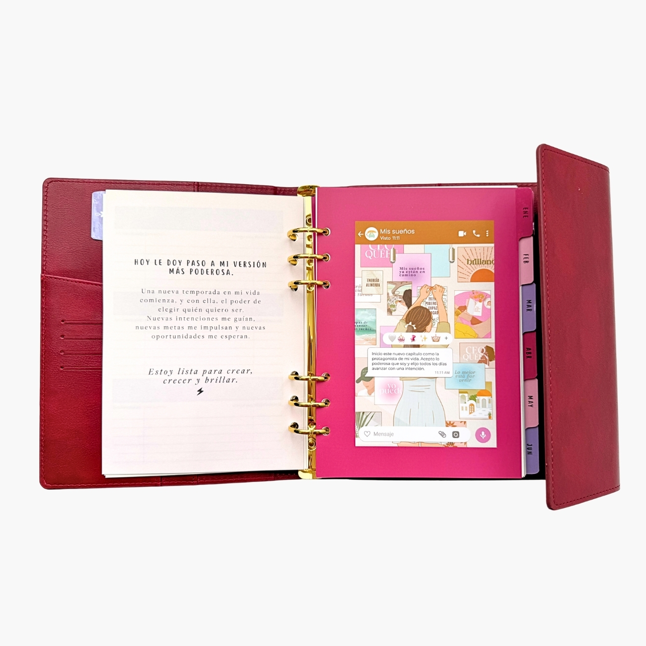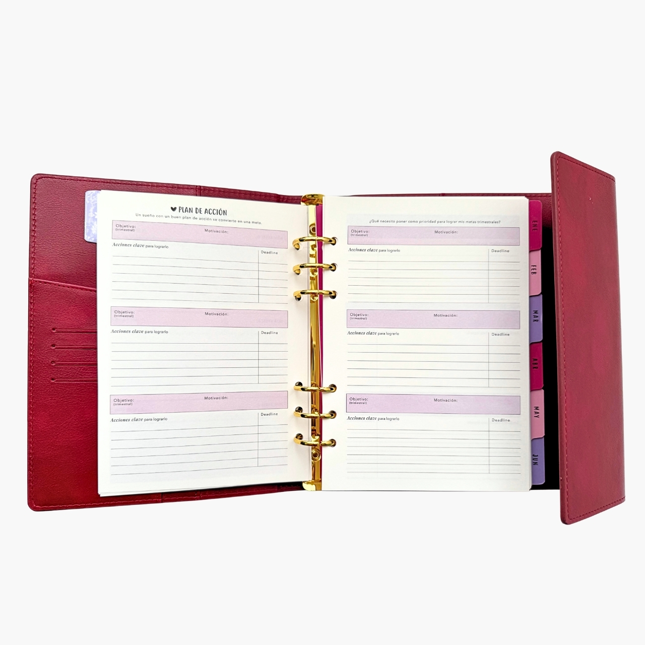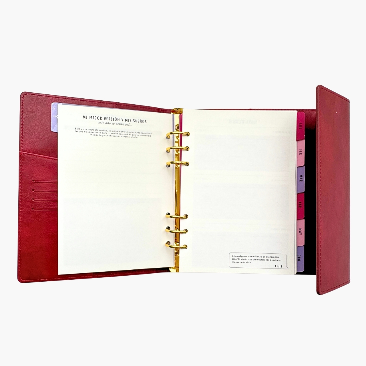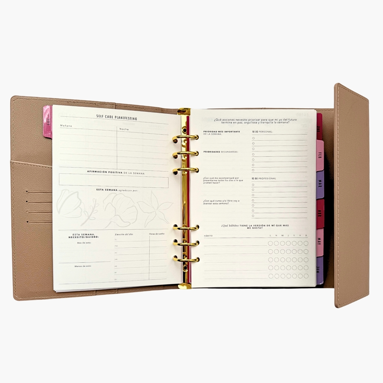โจNรบmero de pรกginas: 320 pags. โจHoja de 100 grms. โจColor de hojas: Hueso. โจMedidas interiores: 21x14.7cm. โจSeparadores: 14 a color impresos dentro de la agenda. โจSobre para guardar documentos. โจHerraje color dorado o rose gold. โจFunda de piel sintรฉtica. โจCierre tipo imรกn.