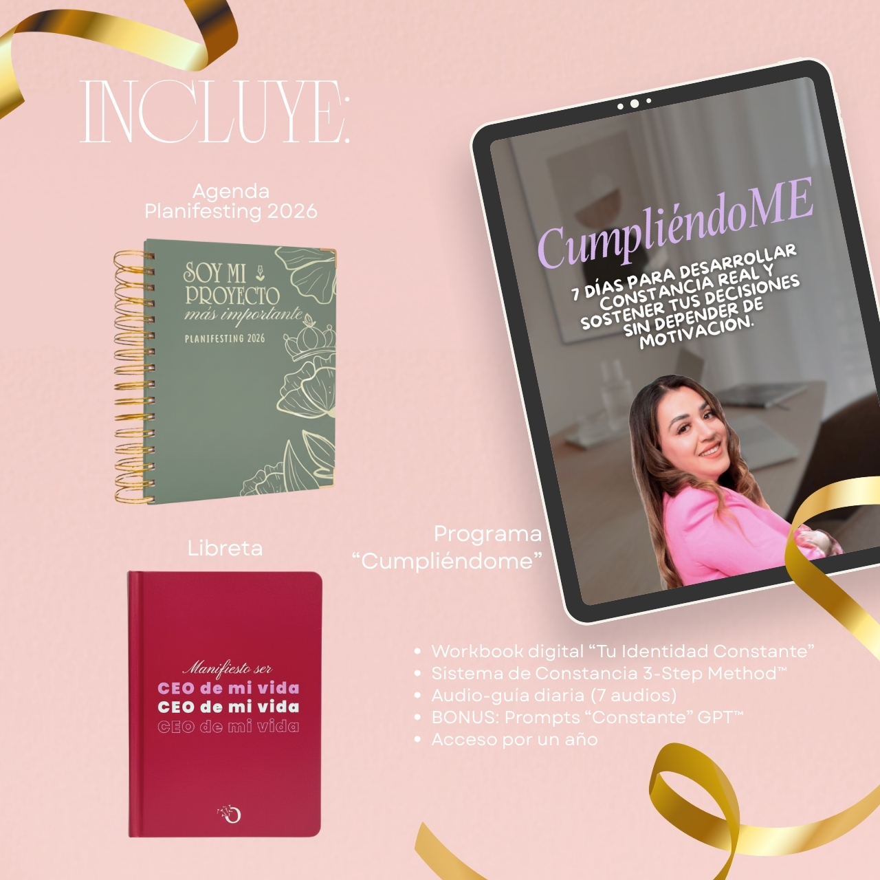 La agenda te da estructura, CumpliéndoME instala la identidad de “soy una mujer que se cumple” en 7 días y los complementos sostienen el ritual diario.