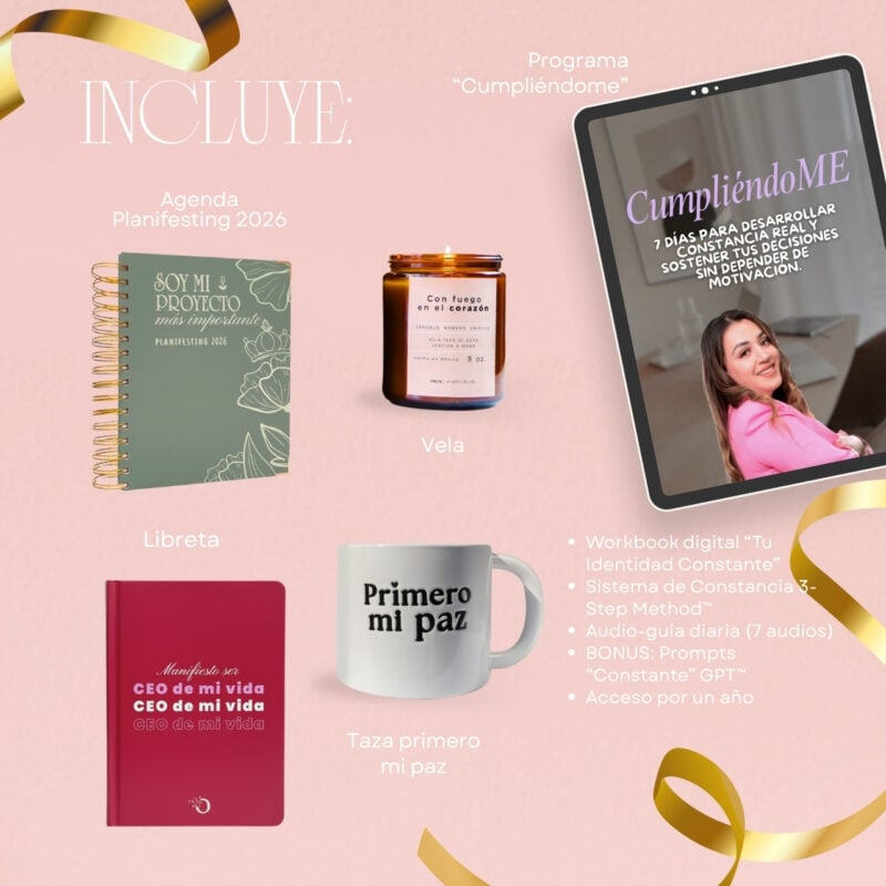✨ 1 agenda espiral del color que prefieras ✨ Acceso al curso CumpliéndoME (7 días): Workbook “Tu Identidad Constante”, plantillas del Sistema 3-Step (Ritual AM, Ritual de Coherencia, Ritual PM), Bitácora de Evidencia (7 días), 7 audio-guías y Pack de 20 prompts “Constante” ✨ 1 libreta de notas ✨ 1 taza ✨ 1 vela aromática